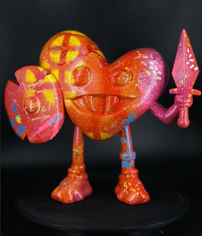 Выглядит как Сердце с мечом и щитом, который стоит на страже своего носителя, то есть каждого из Нас. И пусть он не слишком опрятен и явно не выспался, даже второй носок не успел надеть до конца, но как не уставать, когда нужно всегда "биться" чтобы поддерживать жизнь своего обладателя. В наше время постоянного информационного шума, человек подвергается тем или иным искушениям, которые претят нашему внутреннему миру, и Heart Attack стоит на круглосуточном дозоре, напоминая своим образом что "сердцу не прикажешь" и нужно делать так как оно велит.