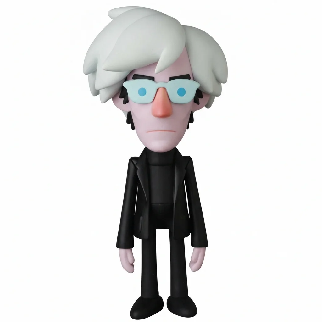 Фигурка Энди Уорхола в исполнении Eric So — это стилизованный образ культового художника, узнаваемого по своему классическому черному костюму, водолазке и фирменным очкам с синими точками на стёклах. Особое внимание уделено деталям: двухцветные волосы в черно-белой гамме точно передают характерный внешний вид мастера, ставшего иконой современного искусства.